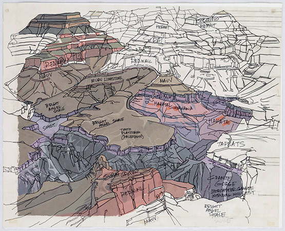 I am interested in the ways that the experience of looking at a place through the lens of a camera differs substantially from the experience of looking at a place optically. It has been my experience that paintings and drawings from life of panoramic vistas are surprisingly unrelated to photographic images. In the Summer of 2011, I was the artist-in-residence for the South Rim of the Grand Canyon. While I was there, I took many photographs, sketched, and made several sustained drawings, the most significant of which is Powell Point (Drawing).