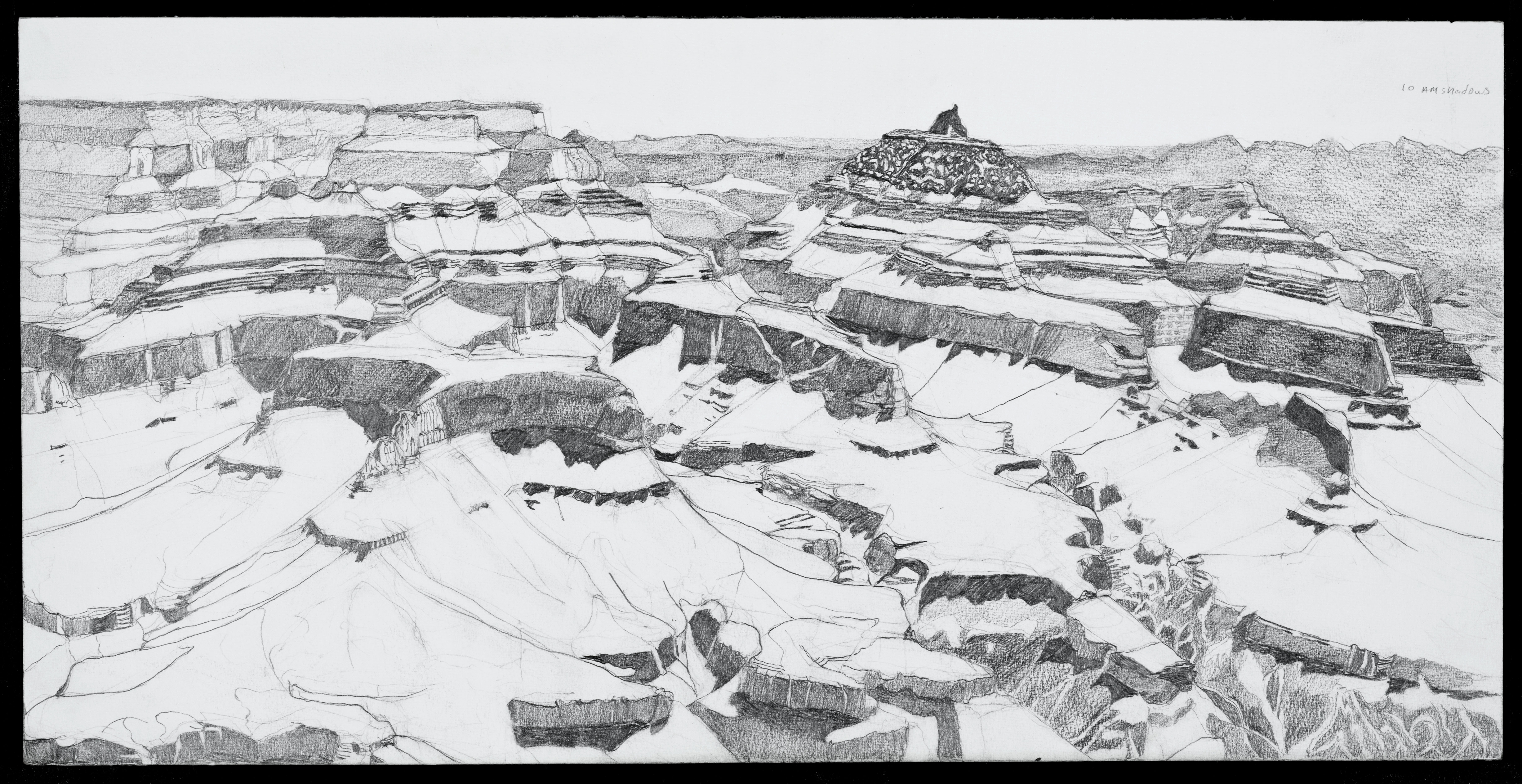 I am interested in the ways that the experience of looking at a place through the lens of a camera differs substantially from the experience of looking at a place optically. It has been my experience that paintings and drawings from life of panoramic vistas are surprisingly unrelated to photographic images. In the Summer of 2011, I was the artist-in-residence for the South Rim of the Grand Canyon. While I was there, I took many photographs, sketched, and made several sustained drawings, the most significant of which is Powell Point (Drawing).